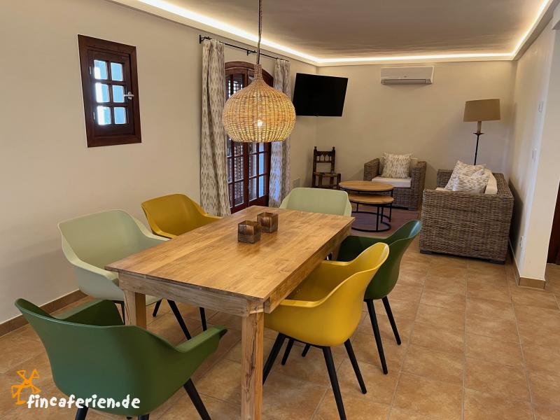 - 1 Wohnraum mit Kamin und integriertem Essbereich